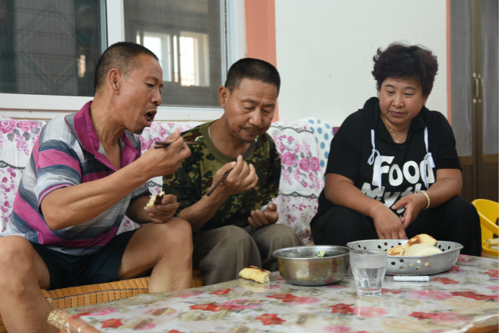 平时吃饭时,殷玉珍(右一)都会等小叔吃完自己再吃。图片来源:青岛文明网