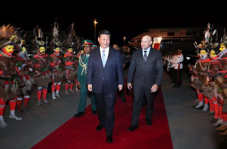 当地时间晚8时05分许,习近平乘坐的专机抵达莫尔兹比港杰克逊国际机场。习近平步出舱门,现场响起热烈的掌声,巴布亚新几内亚副总理埃布尔率政府高级官员在舷梯旁热情迎接。巴布亚新几内亚少年向习近平献上鲜花。红地毯两侧,英姿飒爽的礼兵昂首伫立。当地舞蹈演员头戴羽饰,腰系草裙,手持皮鼓,跳起热情洋溢的迎宾舞蹈。自发赶来的当地民众、中资企业员工和华侨华人簇拥在机场外和中国代表团下榻处,挥舞着中国国旗,热烈欢迎习近平。
