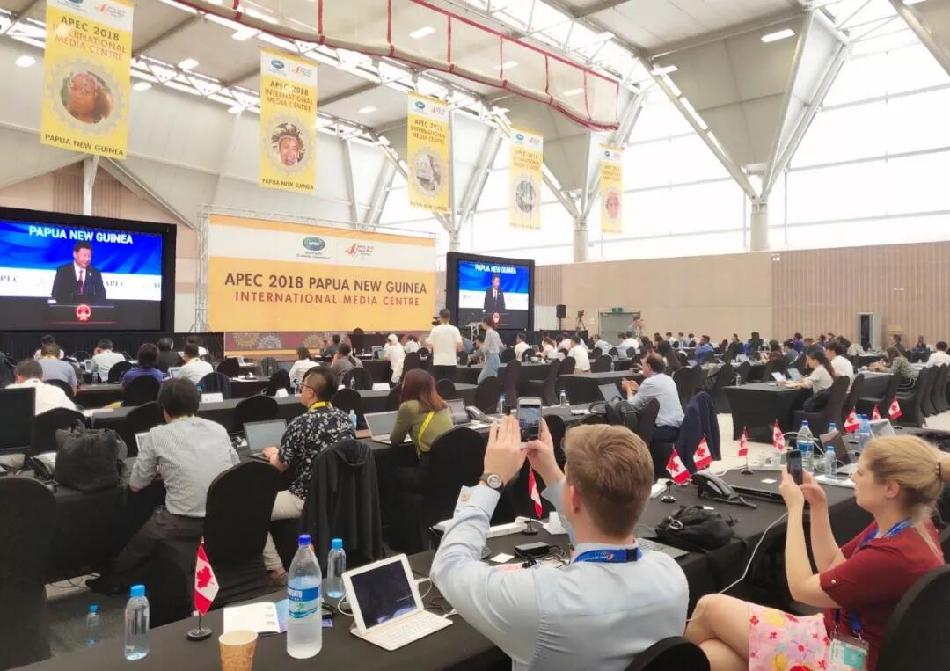 △APEC会议新闻中心,各国记者凝神倾听习近平的演讲。(央视记者李晓周拍摄)