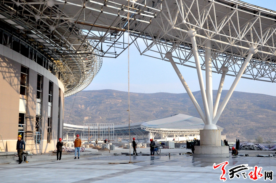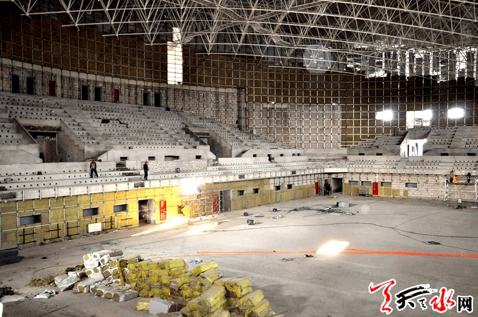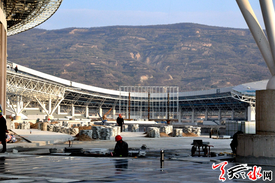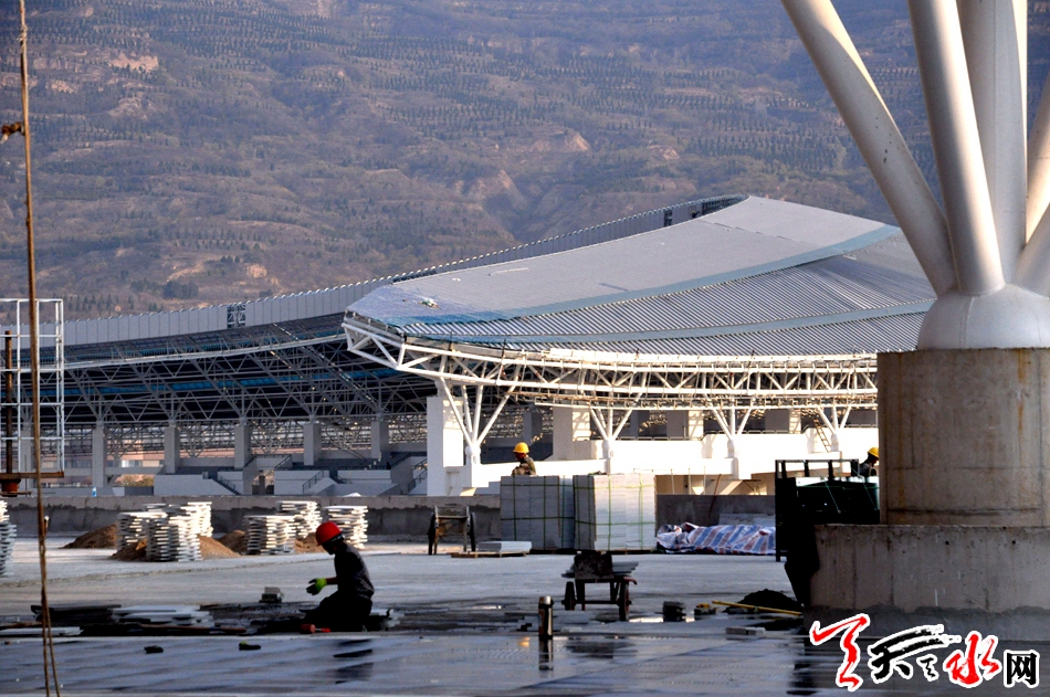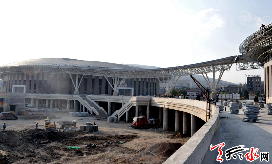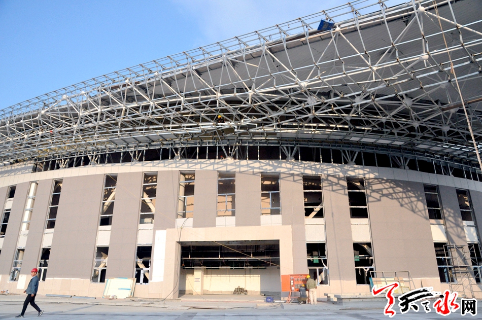 11月19日,在天水市体育中心项目建设现场,施工人员正在紧张施工中。该项目总建筑面积10.5万平方米,建设内容为“两馆一场一校”,2015年12月10日正式开工建设,目前已完成项目“两馆一场一校”主体工程,预计2018年12月底完工。 全媒体记者 冯丽娟 摄