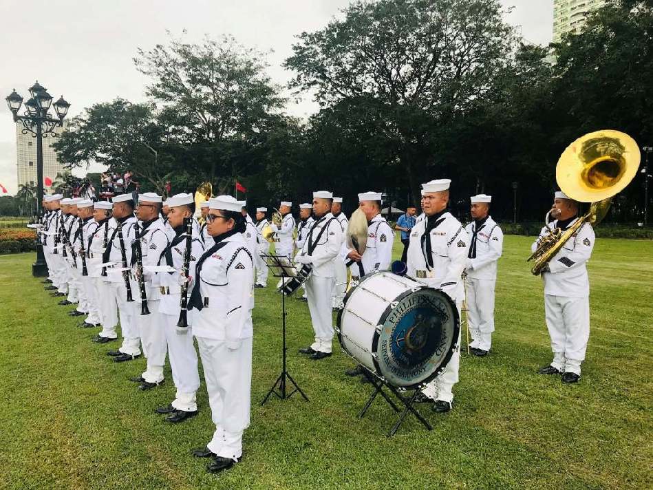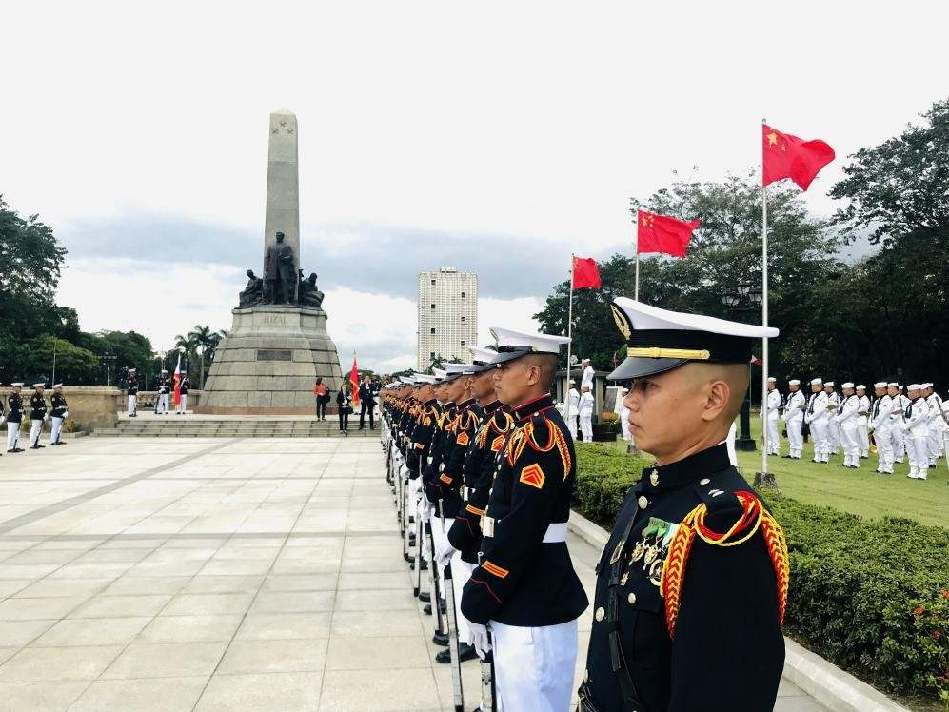 记者在现场看到,仪式开始前一个多小时,菲律宾礼兵和军乐队都已经就位完毕,反复演练。纪念碑前两旁竖有中菲两国国旗,军乐队奏响两国国歌,并鸣放礼枪。