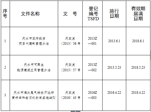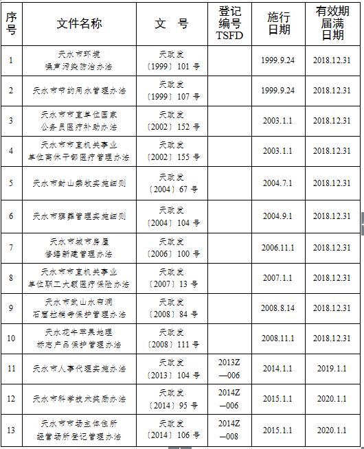 各县区人民政府,开发区管委会,市政府各部门,市属及驻市有关单位: 经2018年11月16日市政府第34次常务会议审议,决定《天水市科学技术奖励办法》等13件市政府规范性文件自公布之日废止;《天水市政府投资项目代建制管理办法》等3件市政府规范性文件有效期届满失效。现将废止和失效的市政府规范性文件予以公布。自公布之日起,废止和失效的市政府规范性文件一律停止执行,不再作为行政管理依据。各县区政府、市政府各部门各单位要做好衔接工作,完善事中事后监管,防止出现政策“空档”。 各县区政府、市政府各部门各单位要认真执行《国务院办公厅关于加强行政规范性文件制定和监督管理工作的通知》(国办发〔2018〕37号)、《甘肃省行政规范性文件管理办法》和《天水市人民政府规范性文件制定程序规定》,严格依法行政,制定市政府规范性文件严禁越权发文、严控发文数量、严格制发程序,确保市政府规范性文件合法有效。