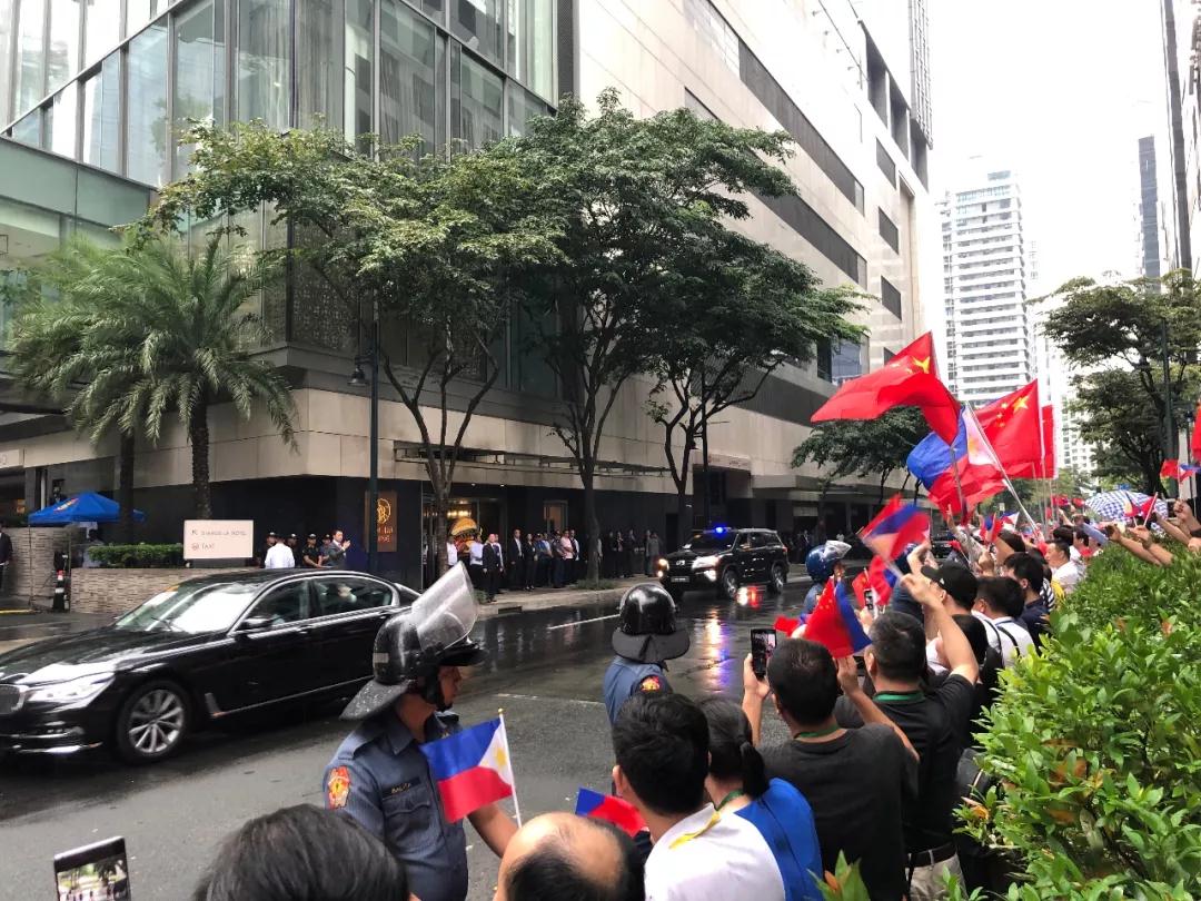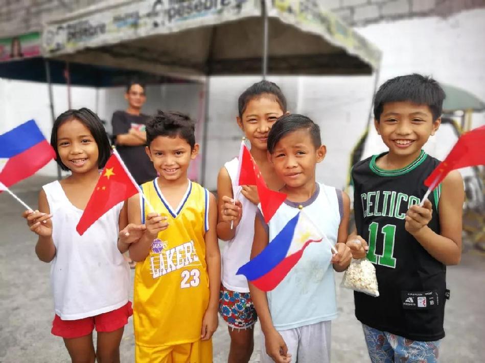 △一群菲律宾孩子手持两国国旗欢迎习近平主席。(央视记者甘露拍摄)