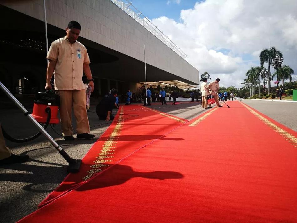 △文莱苏丹哈桑纳尔在王宫前广场为习近平举行了盛大的欢迎仪式。这是仪式开始前工作人员在清理红地毯。(央视记者周志国拍摄)