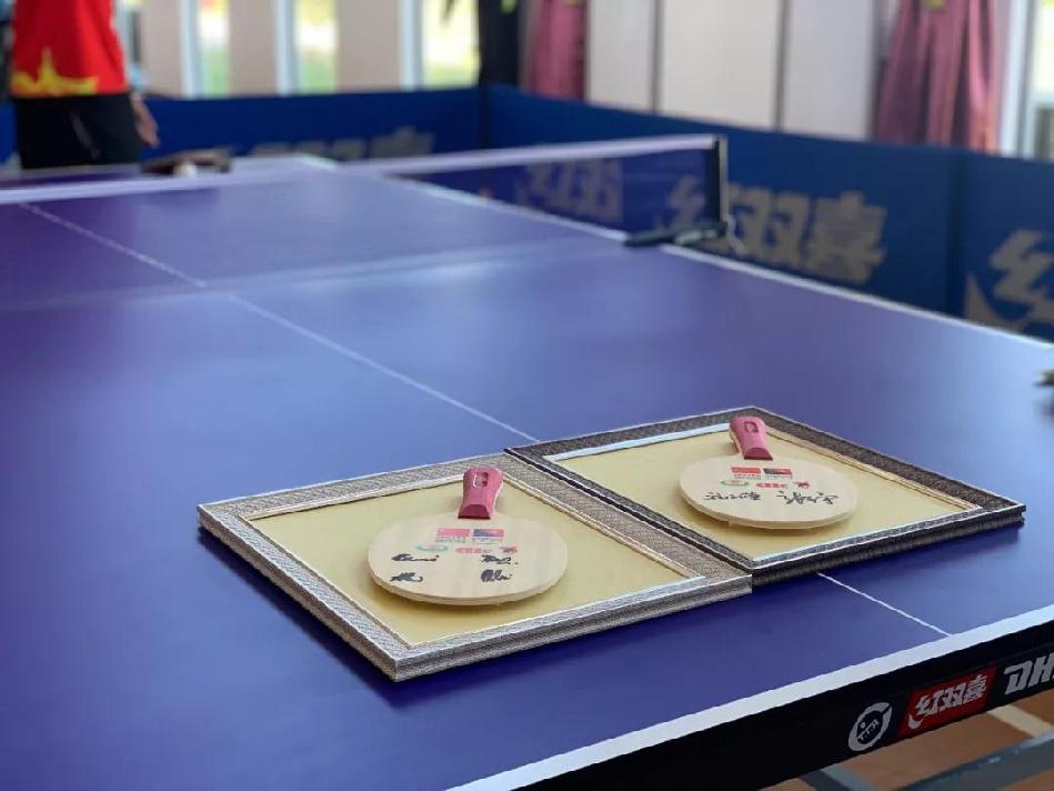 △11月16日习近平主席与奥尼尔总理参加布图卡学园启用仪式时与两国乒乓球运动员亲切交流。这是运动员准备赠送给两国领导人的纪念球拍。(央视记者邓睿拍摄)