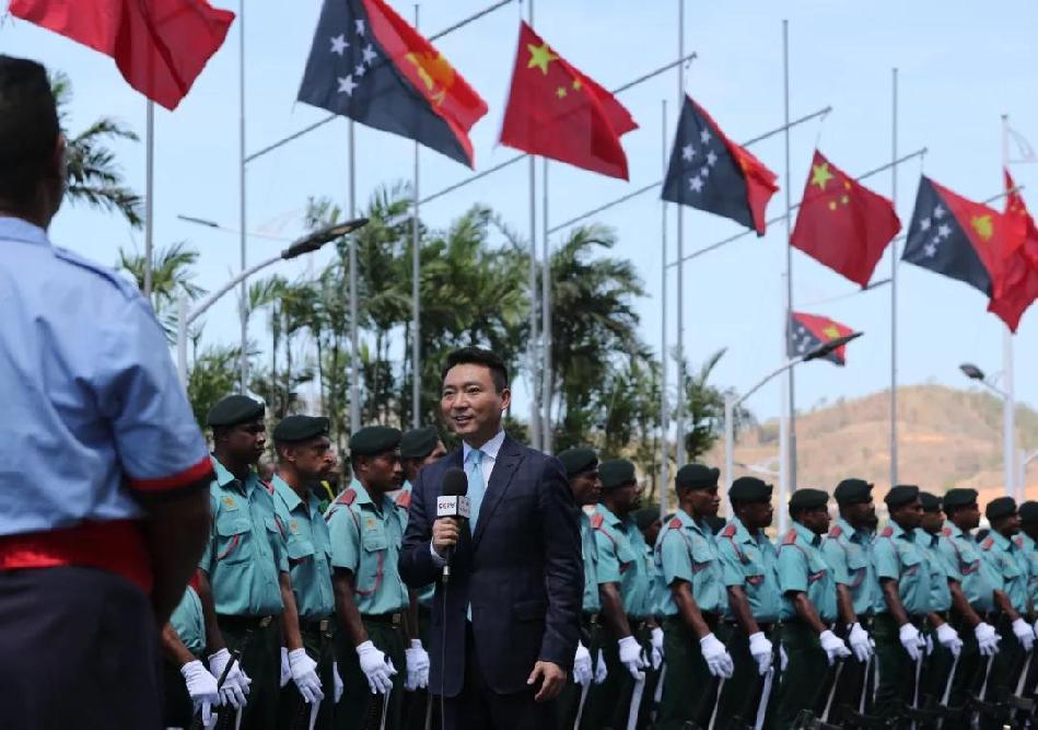 △央视记者康辉在巴新欢迎仪式现场作出镜报道。
