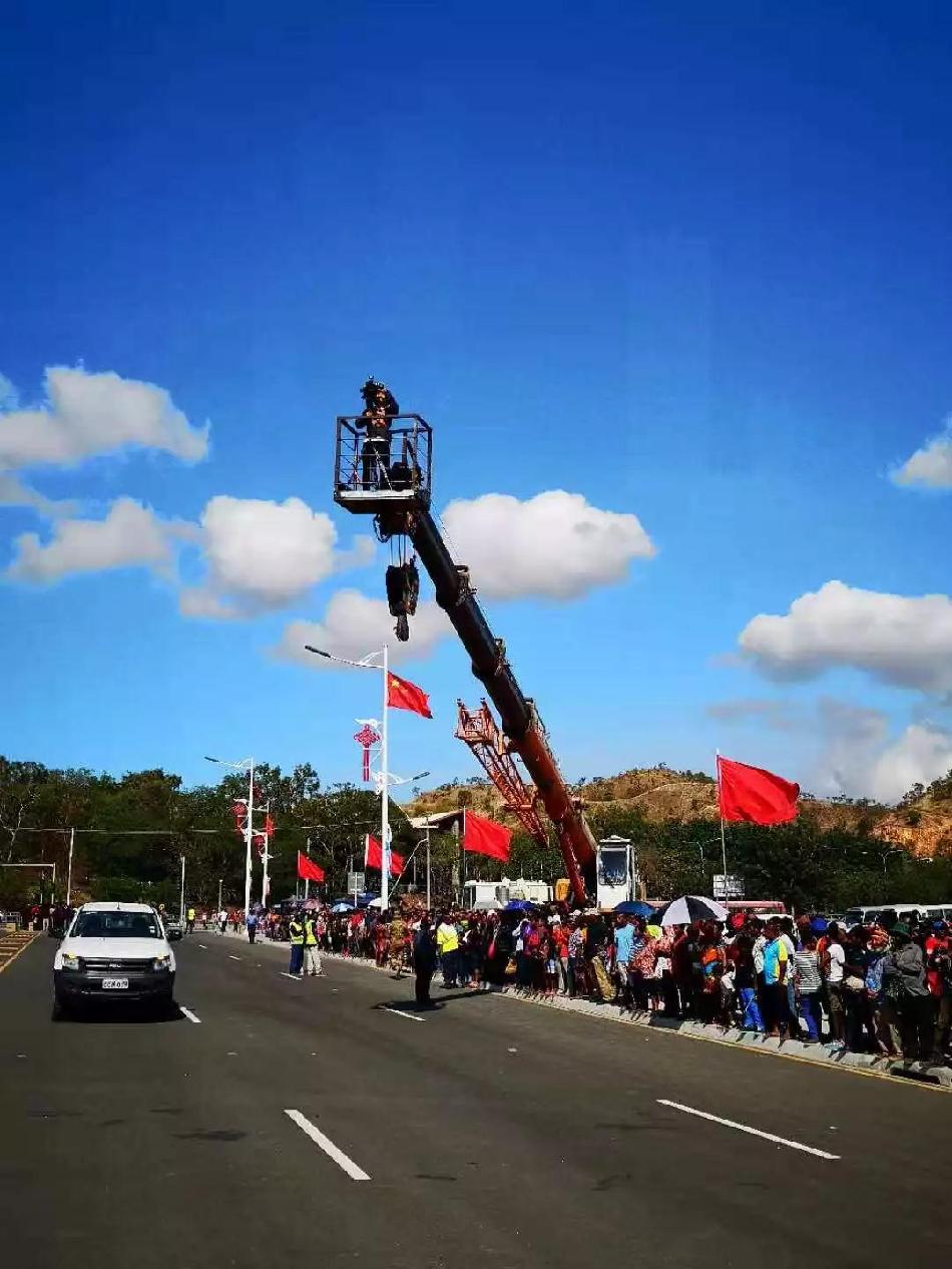 △央视记者张晓鹏登上18米高的汽车吊拍摄独立大道开通现场。(央视记者冯良辰拍摄)