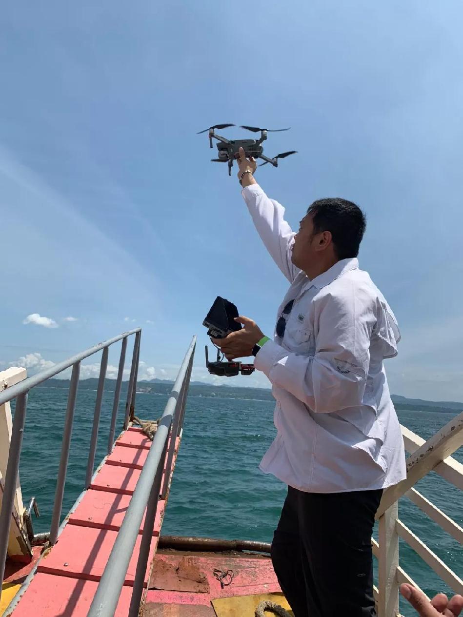△央视记者黄耀祖在海面操作航拍器。许多精美的航拍画面出自他之手。(央视记者黄铮铮拍摄)