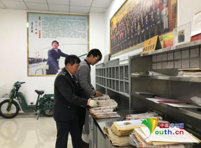 唐真亚(左)在支局分拣信件。图片来源:中国青年网