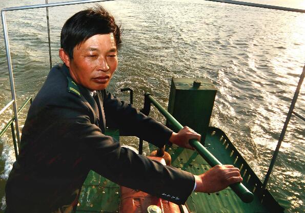 夕阳西下,唐真亚扶在船杆上凝神思考。图片来源:江苏文明网 吉尔云摄