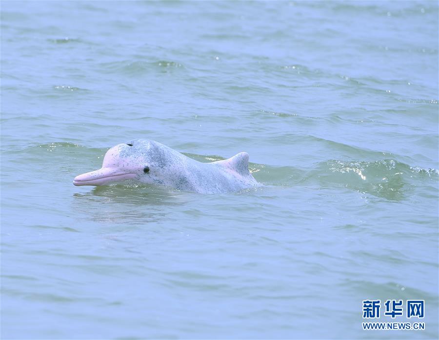 广西钦州市三娘湾海域,一头野生中华白海豚在自由嬉戏,萌态十足(6月10日摄)。新华社记者 周华 摄