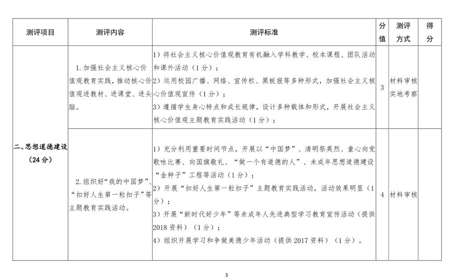 二、本测评细则依据《全国文明校园创建管理办法》(文明委〔2018〕3号)、《甘肃省文明校园建设管理办法》《中小学校“文明校园”评选细则》(甘教基一〔2016〕12号)及全国未成年人思想道德建设测评体系(2018年版)制定,适用于普通中小学校、中等职业学校,九年一贯制学校等参照此测评细则。