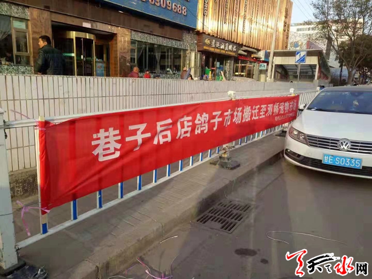 秦州区成纪大道巷子后店内有若干家售卖家禽的商贩,经常将小巷道堵的水泄不通,也给小巷道内环境造成一定程度的污染,尤其周六、周日更是有大量的商贩聚集于此,售卖鸽子、鸡。此问题也是附近居民反映最多的问题,经过中队多方协调,将成纪大道巷子后店内的家禽市场搬迁至双桥宠物交易点。中队执法人员前期宣传,悬挂搬迁宣传横幅,耐心与商贩交谈,积极配合搬迁工作。