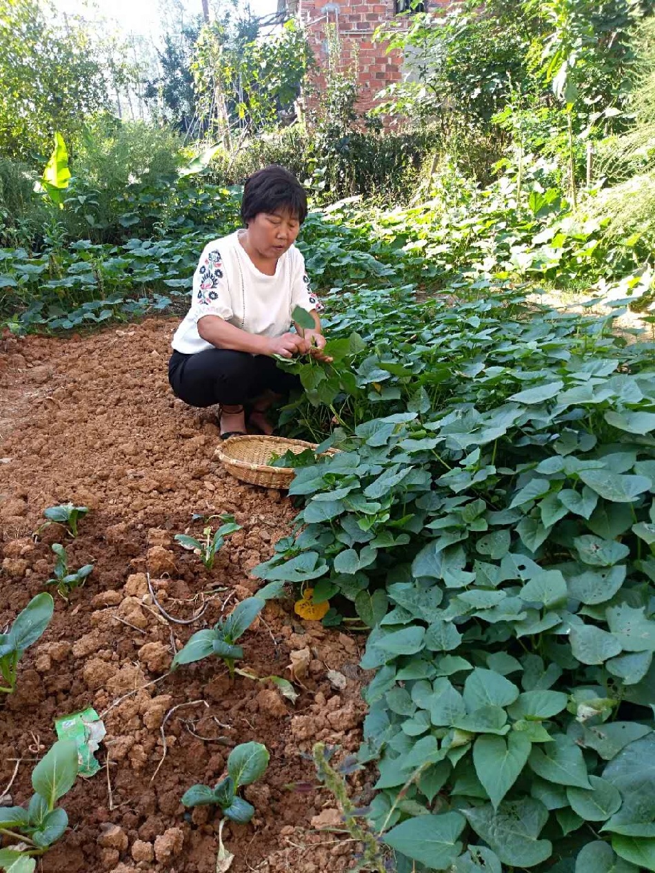 潘来香在菜园摘菜 图片来源:湖北文明网