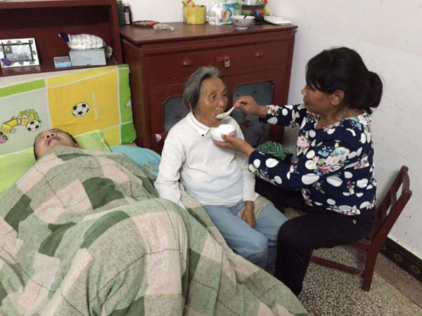 2014年12月,婆婆董自秀突发脑溢血,右手右脚严重萎缩,生活不能自理。