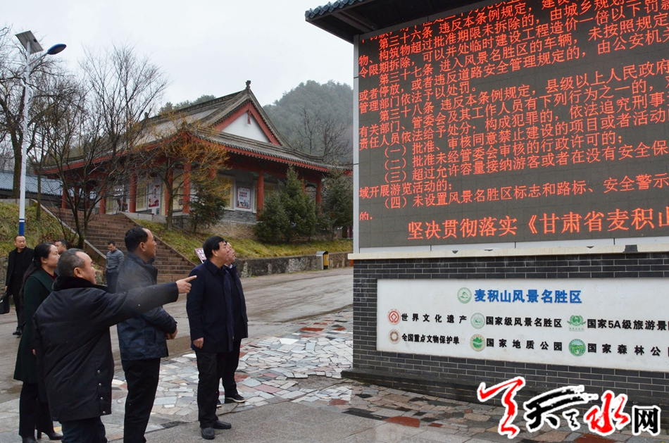 天天天水网讯【记者马凯】12月2日,副市长逯克宗带领麦积山大景区管委会和麦积区政府相关负责人,就《甘肃省麦积山风景名胜区条例》贯彻执行情况,冬季旅游安全和森林防火等工作进行检查。