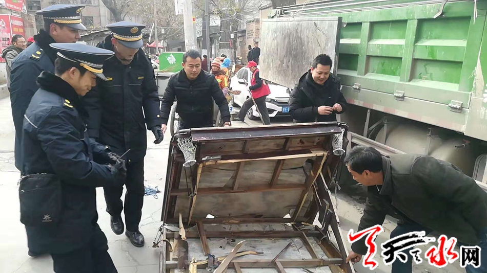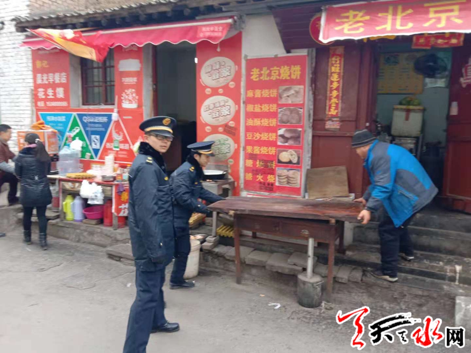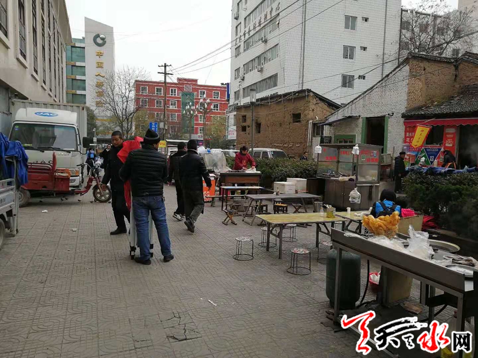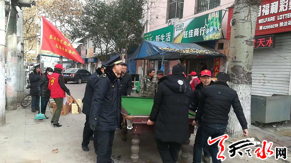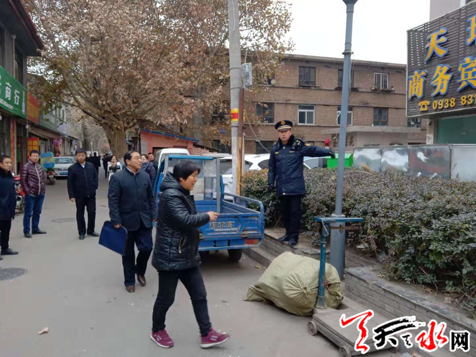 天天天水网讯 (通讯员 孟剑锋)12月7日上午,秦州区执法局东关党支部以“12月份主题党日”为契机,联合忠武巷社区党委共出动人员20人,对忠武巷、北园子市场周边环境卫生进行了整治。此次整治行动,共依法暂扣广告牌2块,清理流动摊点36处、暂扣帐篷1顶、暂扣台秤两台、清理乱吊乱挂9处,乱张贴17处、规范店外经营28户;并对屡教不改、长期倚门经营占道经营、周边卫生脏乱差等影响市容市貌的经营户,进行法律法规宣传,纠正并督促经营户规范经营。