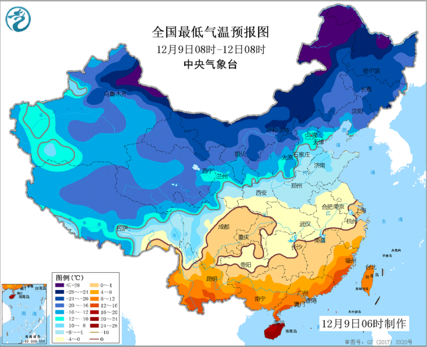 据中央气象台网站消息,中央气象台12月9日06时继续发布寒潮蓝色预警:受强冷空气影响,预计9日至12日,我国中东部地区气温仍持续偏低。过程期间最低气温0℃线将位于江南北部至贵州中部一带,江淮、江汉、贵州中北部、江南北部最低气温为-3~-1℃。受补充冷空气影响,10日至11日,内蒙古中西部、西北地区东部、华北西部和北部、黄淮等地有4~5级偏北风,气温下降4~6℃。