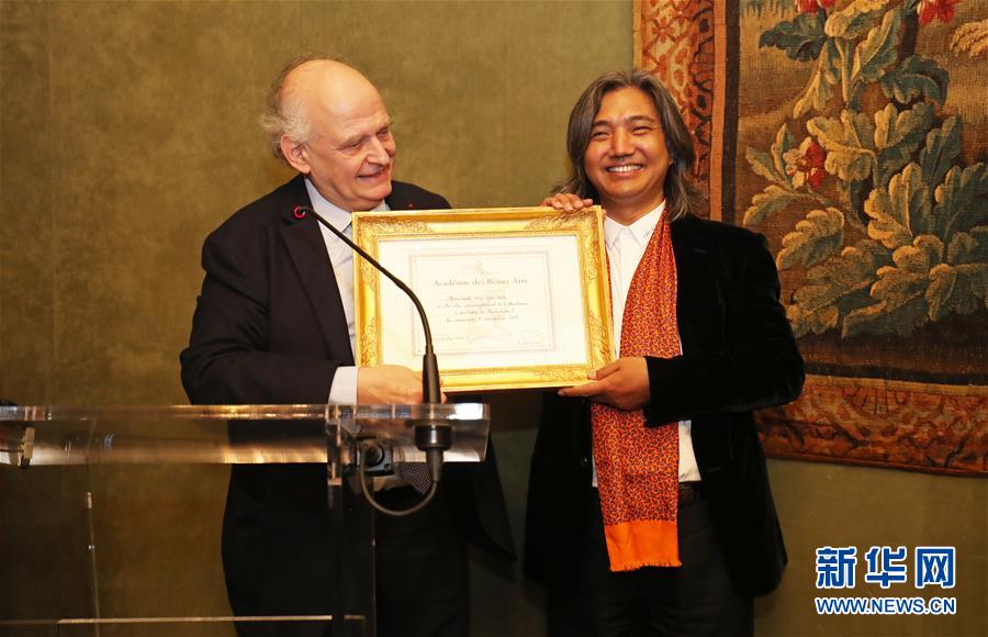 11月14日,在法兰西艺术院,中国雕塑家吴为山(右)接过就职任书,成为继画家吴冠中之后第二位就任该院通讯院士的中国艺术家。新华社发(戚洪岩 摄)