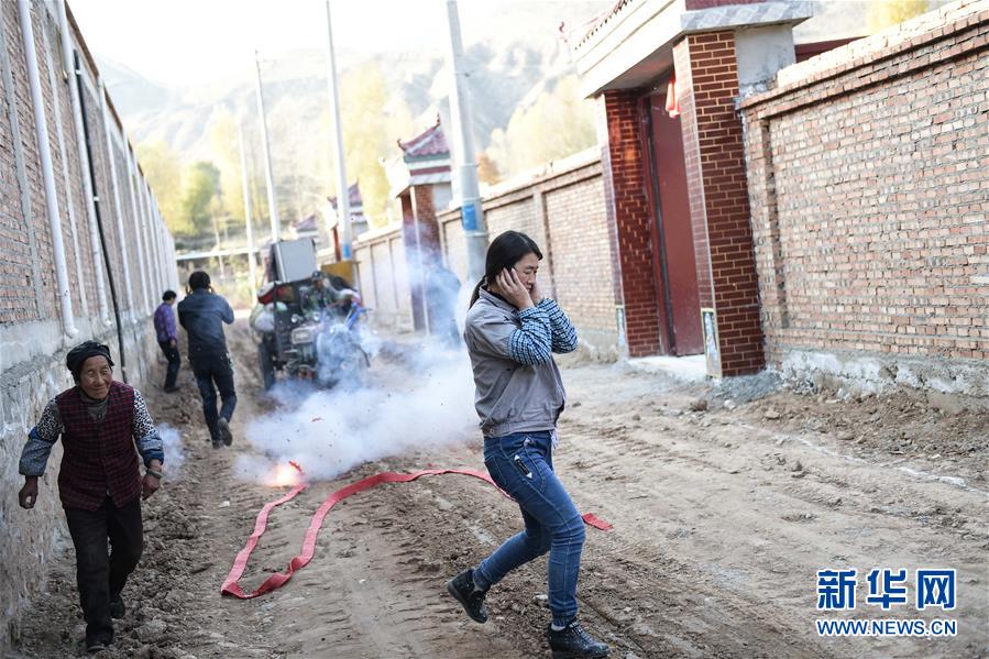 在青海省民和回族土族自治县松树乡牙合移民新村,贫困户胡秀英家在新家的门口放鞭炮庆祝(11月2日摄)。新华社记者 吴刚 摄