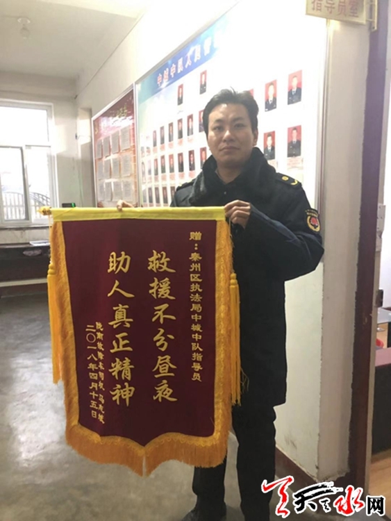 天天天水网讯(通讯员 寇丽丽)2018年12月10日下午,秦州区执法局中城中队迎来了一位满脸感激的青年人,满怀感激的将一面印有“救援不分昼夜,助人真正精神”的锦旗送于中城中队指导员。感谢刘指导在半年前对自己陷入困境的帮助。