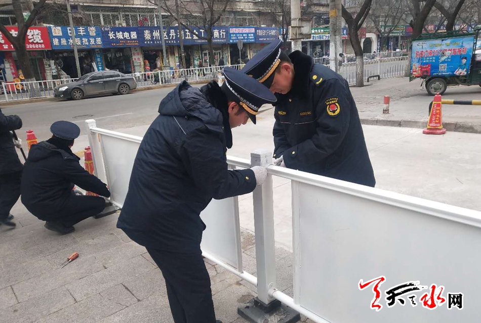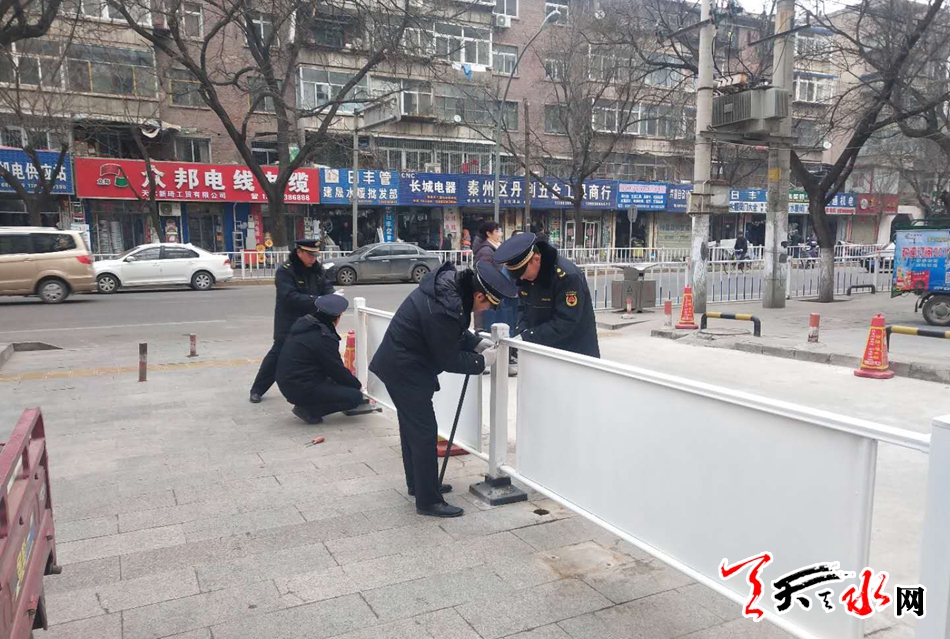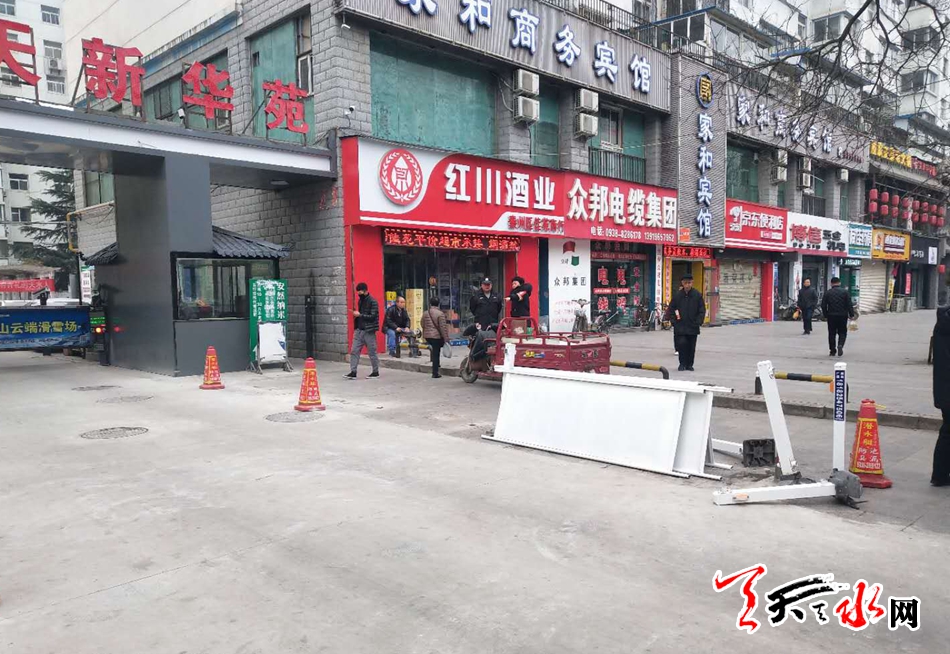 12月14日经群众在《天天天水网政风行风热线》举报,秦州区新华中路兰天新华苑正门进出口有设置的封道栏杆,阻挡人行道,严重影响行人通行。