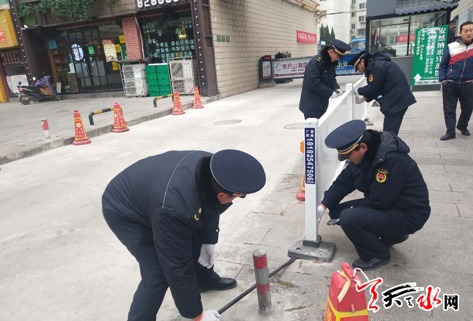 对此秦州区执法局中城中队立即派执法人员前去现场了解情况,兰天新华苑物业擅自设置影响行人通行的封道栏杆,封道栏杆从兰天新华苑正门一直设置到马路道牙,严重阻碍行人通行。
