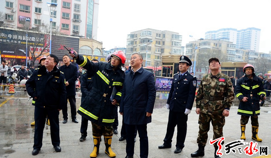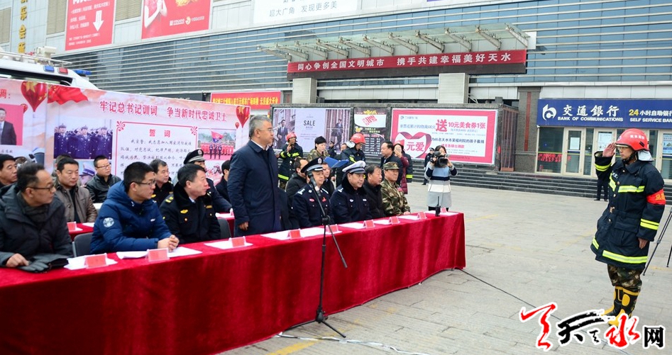 天天天水网讯【记者闫波】12月20日,我市在兰天城市广场举行“践行总书记训词,打造过硬消防救援队伍”高层建筑灭火救援综合演练。市委常委、常务副市长赵四辈宣布演练开始。