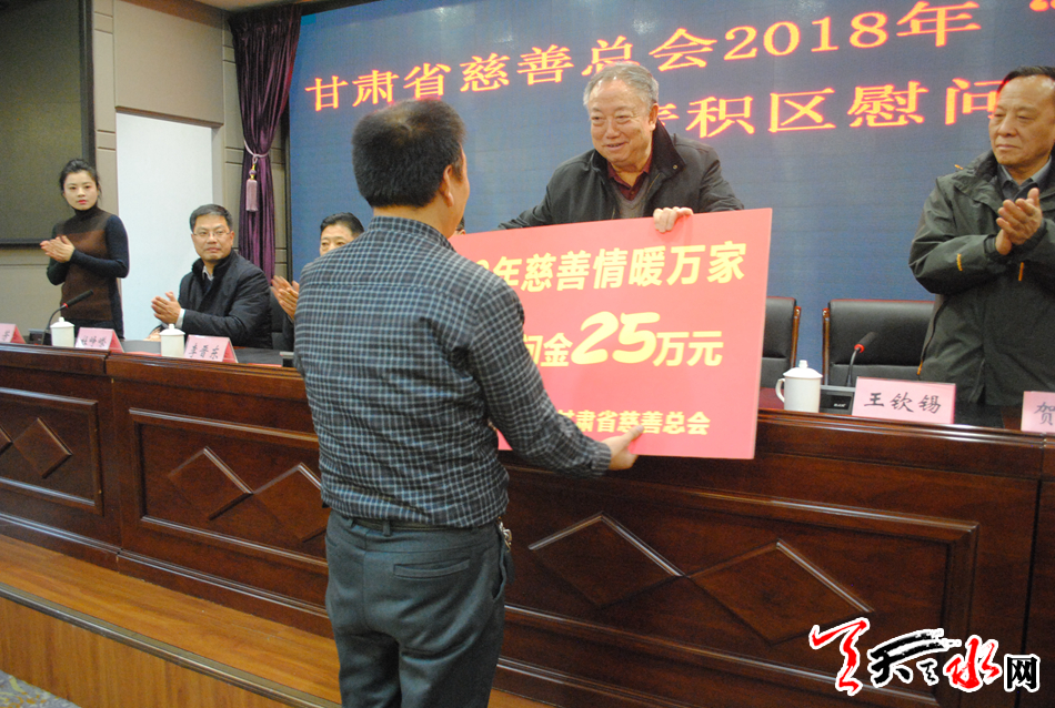 天天天水网讯【记者陈娟】12月21日,省慈善总会在麦积区举行“慈善情暖万家慰问救助活动”。 此次活动共救助17镇3街道的82户困难群众,捐助资金25万元,现场为30户困难群众每户发放现金3000元。