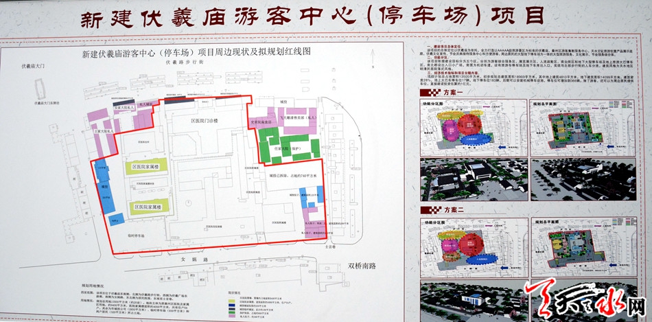 据了解,伏羲庙大景区游客服务中心项目位于秦州区伏羲庙东南侧,项目用地原为秦州区人民医院所在地,西起伏羲文化广场,东至伏羲城牌楼双桥中路,规划建设游客综合服务区、展览展示区、人流疏散区、商业街区和地下大型停车场及地上旅游大巴停车场。