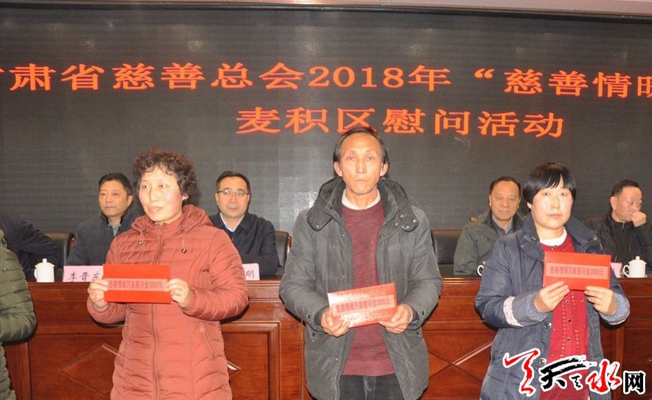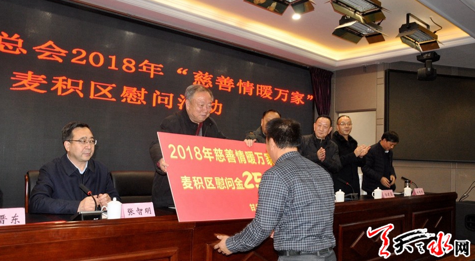 天天天水网讯【记者陈娟】12月21日,省慈善总会在麦积区举行“慈善情暖万家慰问救助活动”。此次活动共救助17个镇3个街道的82户困难群众,捐助资金25万元,现场为30户困难群众每户发放现金3000元。