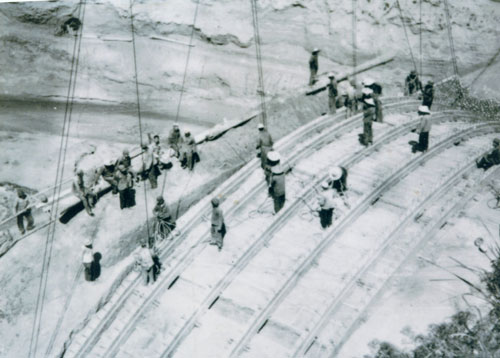 图为施工人员用自制的索吊起吊第一片拱肋的现场