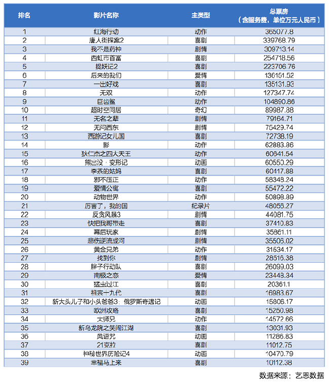 动作类型成为2018年国产电影票房的大赢家,枪战动作片《红海行动》《无双》《反贪风暴3》,古装动作片《狄仁杰之四大天王》《影》等动作电影均取得了不俗的票房成绩,其中《红海行动》仍稳坐2018年度票房冠军宝座。