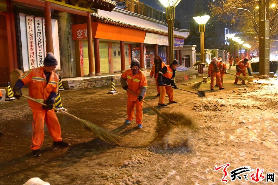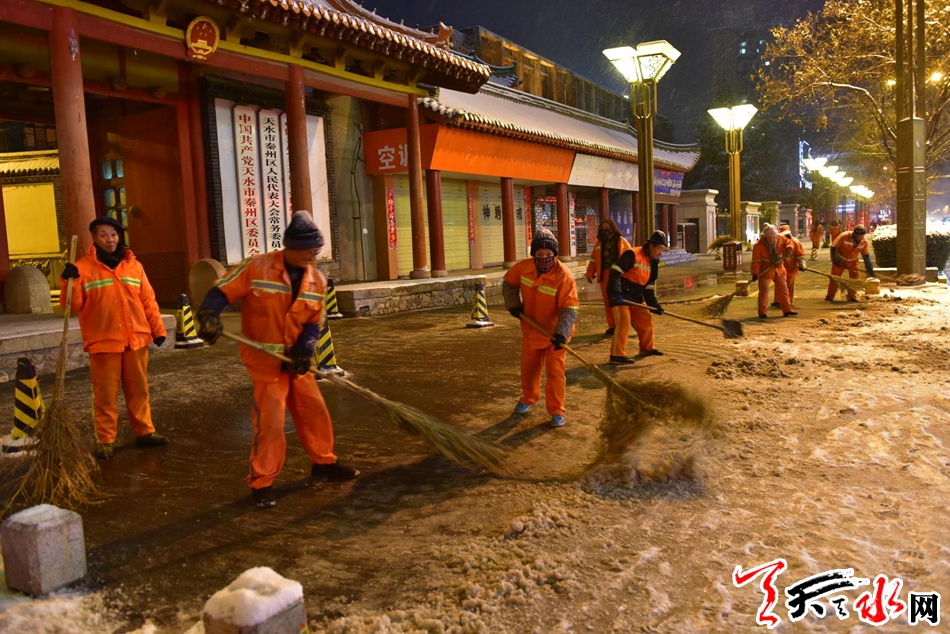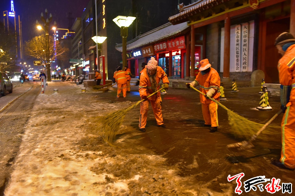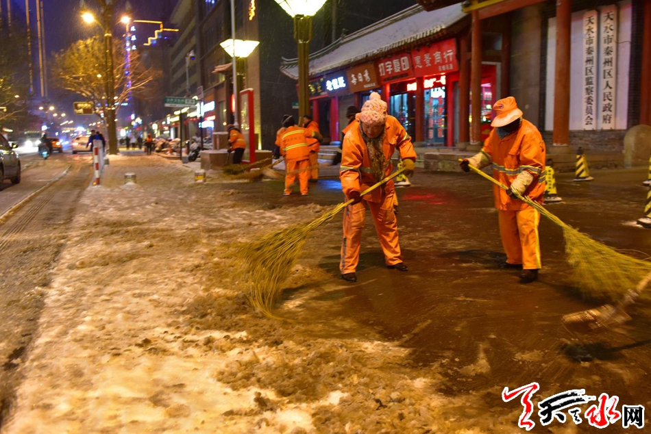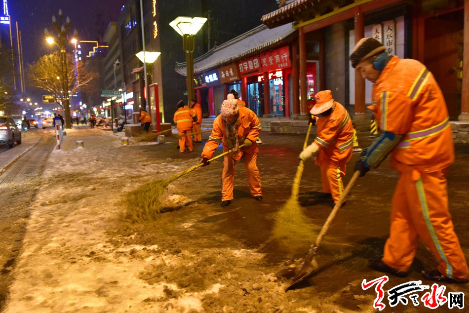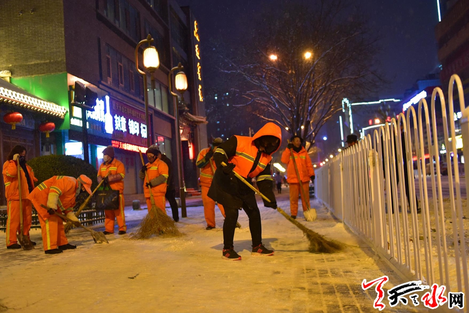 今晚,我市环卫工人连夜扫雪,他们感动了整个天水12月27日晚,环卫工人在秦州区民主东路连夜扫雪。当日,一场大雪降临我市,尽管雪花很美、雪中的城市十分迷人,路面厚厚的积雪给市民出 行带来不便。为保障群众的出行安全,秦州区环卫部门的干部职工“以雪为令”,连夜奋战,对我市主要路段人行道的积雪进行清理,确保早晨人行道路基本无积雪,市民出行畅通。天天天水网记者 周文涛 摄