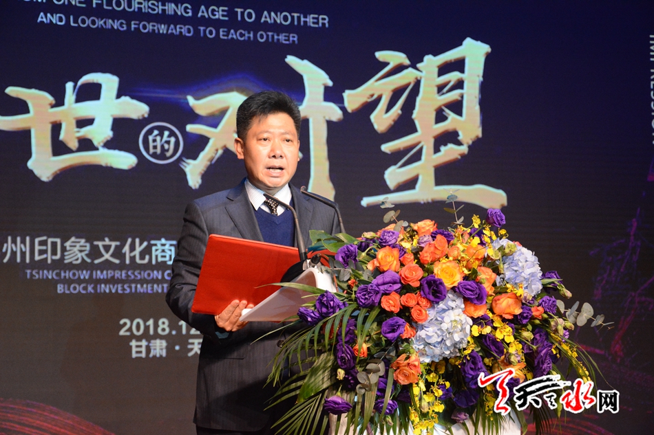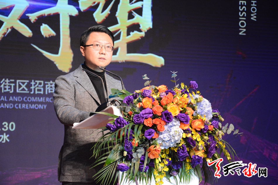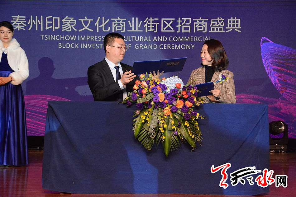 天天天水网讯【记者杨旭】12月30日上午,秦州印象文化商业街区招商推介及签约活动在天水宾馆会议中心举行。特邀嘉宾主持水均益主持签约活动。区相关领导、项目负责人及签约入驻商家代表等应邀参加了推介签约活动。
