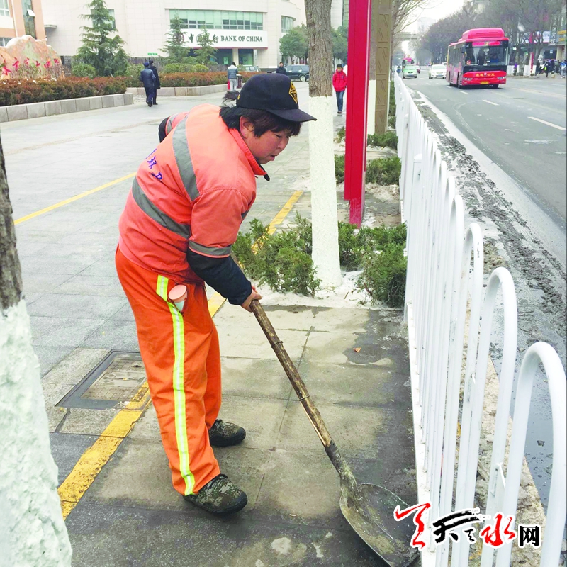 2018年12月31日下午,天空中飘着零星的雪花,路上的行人瑟缩着身子,不时跺着脚,在秦州区民主路六中附近,记者见到了正在铲路边积雪的环卫工人张春花,她正在认真地清扫着路面上的积雪,一点点地向前方挪动步子。