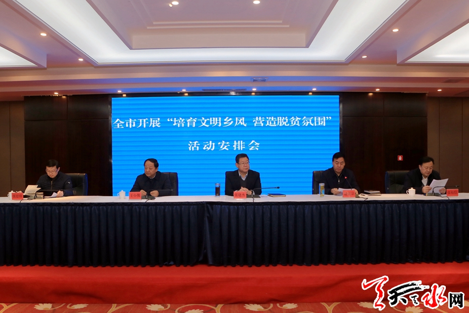 天天天水网讯【全媒体记者马放】1月4日,全市开展“培育文明乡风 营造脱贫氛围”活动安排会召开,市委常委、宣传部部长张建杰出席会议并讲话,副市长逯克宗主持会议。