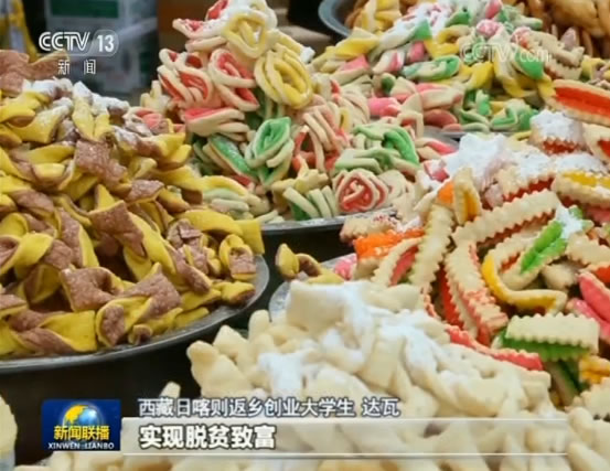 在日喀则年货市场,返乡创业大学生达瓦去年创办了一家藏族特色食品公司,已帮助几十个贫困户实现了就业。