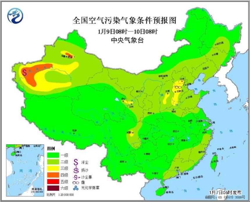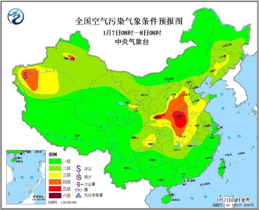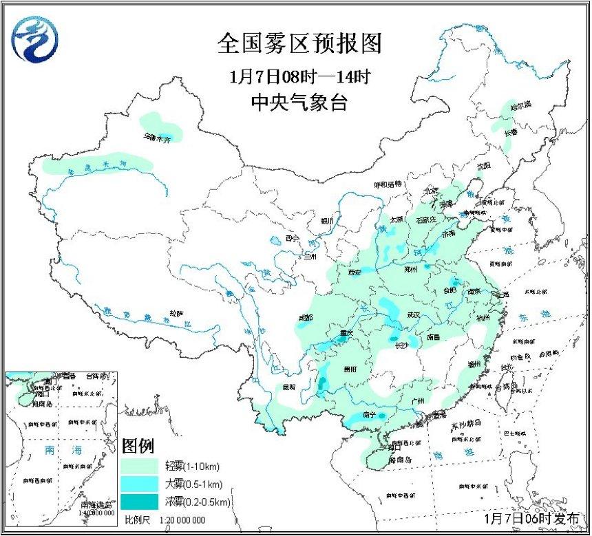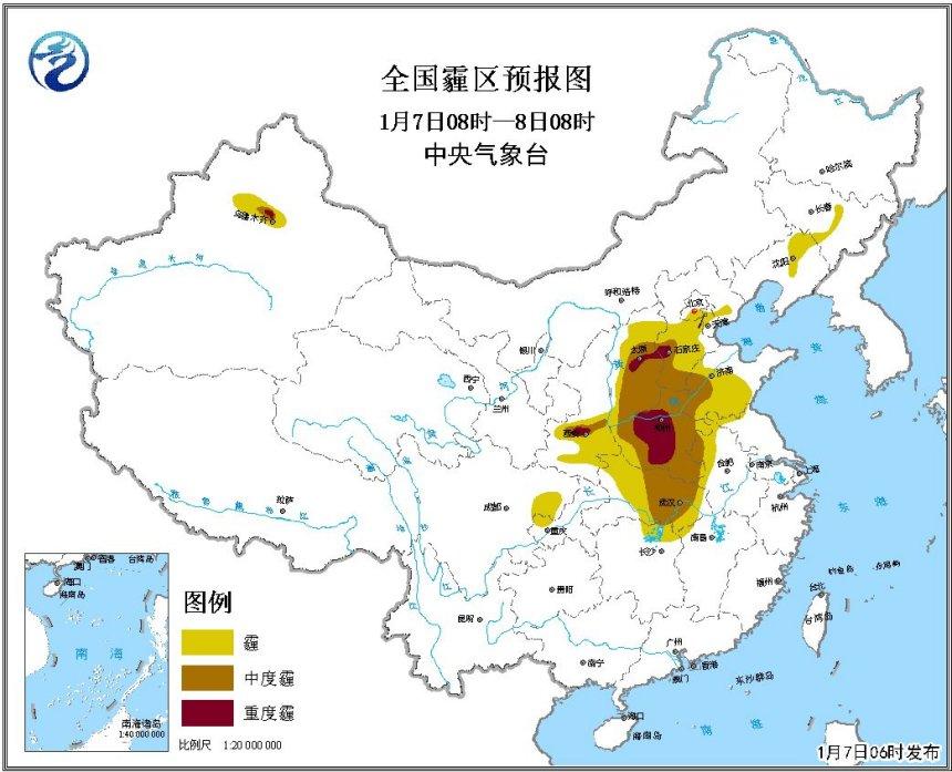 中新网1月7日电 据中央气象台网站消息,7日白天,华北南部、黄淮、江淮西部、江汉、汾渭平原等地的大气扩散条件较差,将有轻至中度霾,江淮西部、江汉、汾渭平原等地的部分地区有重度霾天气。受冷空气和降水影响,7日至8日,上述地区的霾天气将自北向南逐渐减弱消散。9日至11日,大气扩散条件再次转差,有轻至中度霾。另外,7日上午,湖北南部、湖南北部、贵州西部、广西南部等地的部分地区有大雾。