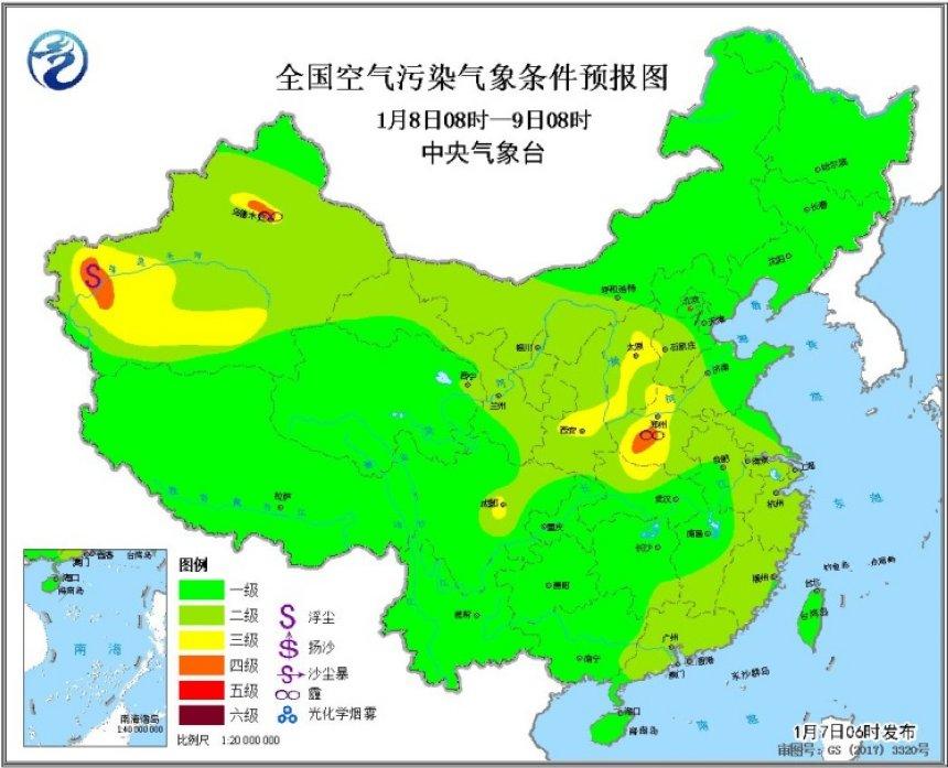 7日白天,汾渭平原有中至重度霾天气,7日下午起至8日,受冷空气影响,区域霾天气将逐渐减弱。