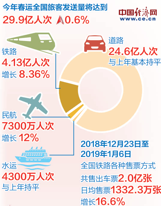经济日报-中国经济网北京1月7日讯(记者 顾阳 王轶辰)2019年春运将从1月21日开始,3月1日结束,共计40天。经预测,春运全国旅客发送量将达到29.9亿人次,比上年增长0.6%。自2018年12月23日铁路部门发售春运第一天车票以来,网上网下各种售票方式运行平稳有序,同比总量上升,今年春运铁路第一轮售票高峰平稳度过。