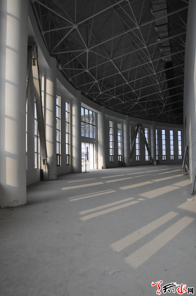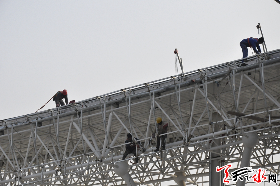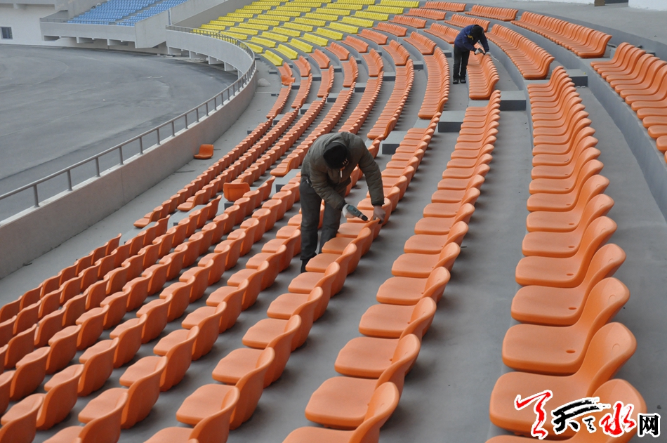 大平台位于体育场、体育馆和游泳馆之间,是联系三个建筑的纽带,采用柱下独立基础,框架结构。目前,位于体育中心北侧的体育场基础工程已经结尾,现场有工人正在安装座椅。游泳馆和体育馆正在进行内部装修。