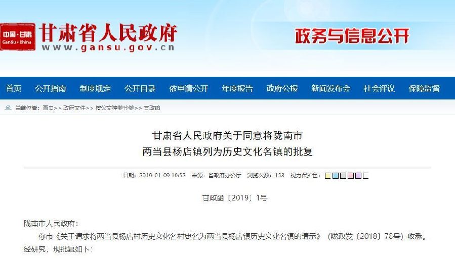 你市《关于请求将两当县杨店村历史文化名村更名为两当县杨店镇历史文化名镇的请示》(陇政发〔2018〕78号)收悉。经研究,现批复如下: