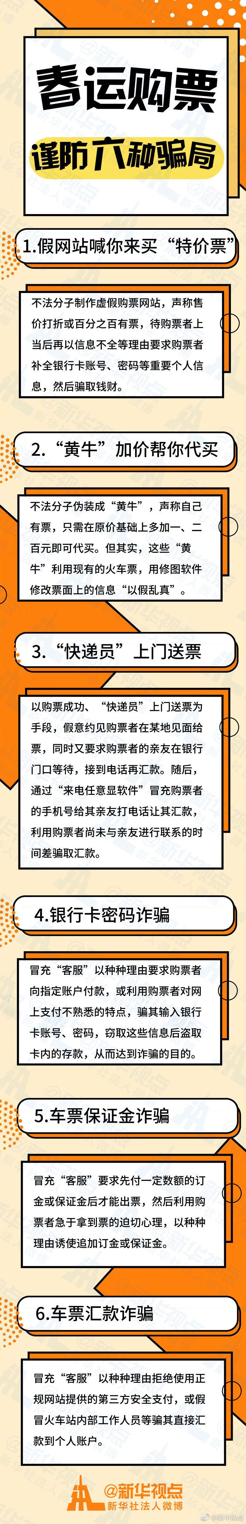 2019年春运即将到来,不少旅客正在通过电话或网络抢购车票,而一些不法分子也趁机谋划种种购票骗局,骗取旅客钱财。戳图,谨防这六种骗局⬇
