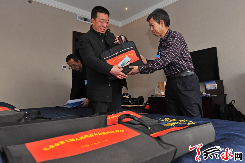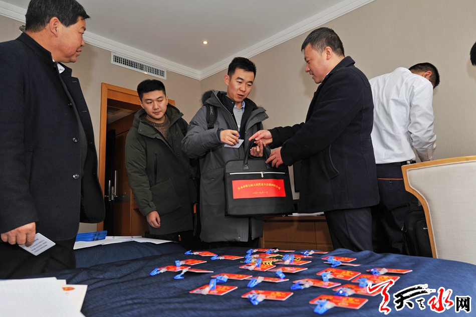 1月14日,工作人员为市人大代表发放代表证和会议资料。当天上午,参加市七届人大四次会议的人大代表准时来到天水宾馆各代表团驻地报到。市七届人大四次会议将于1月15日上午开幕,会期三天半。 记者 孙镇 摄