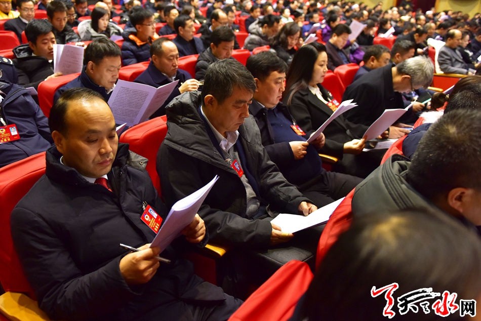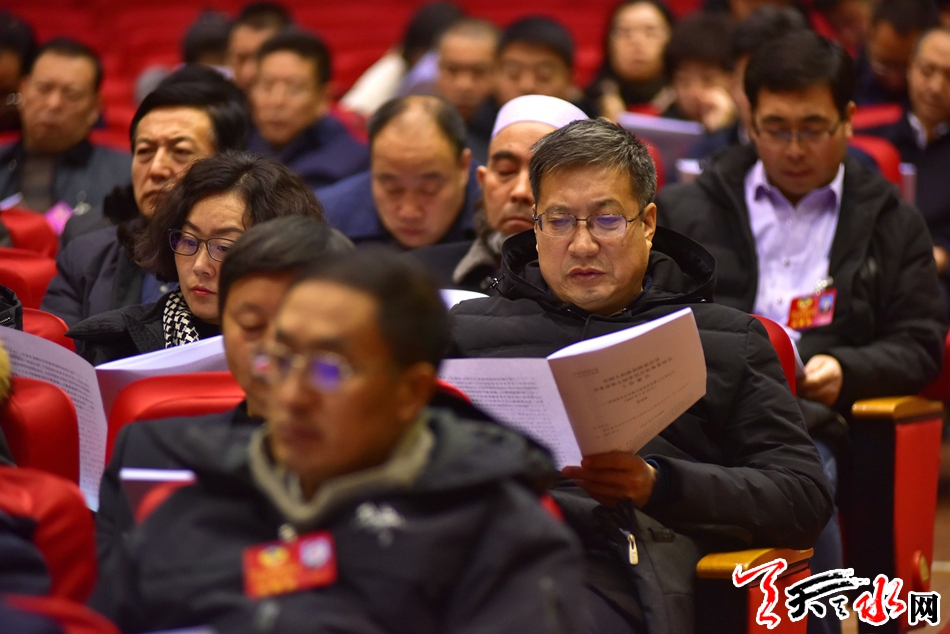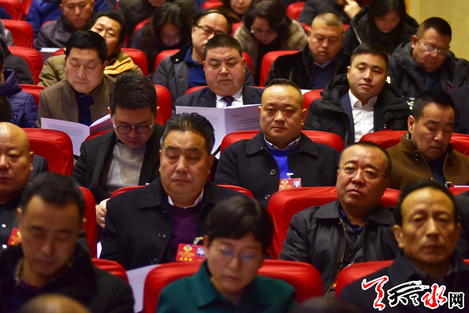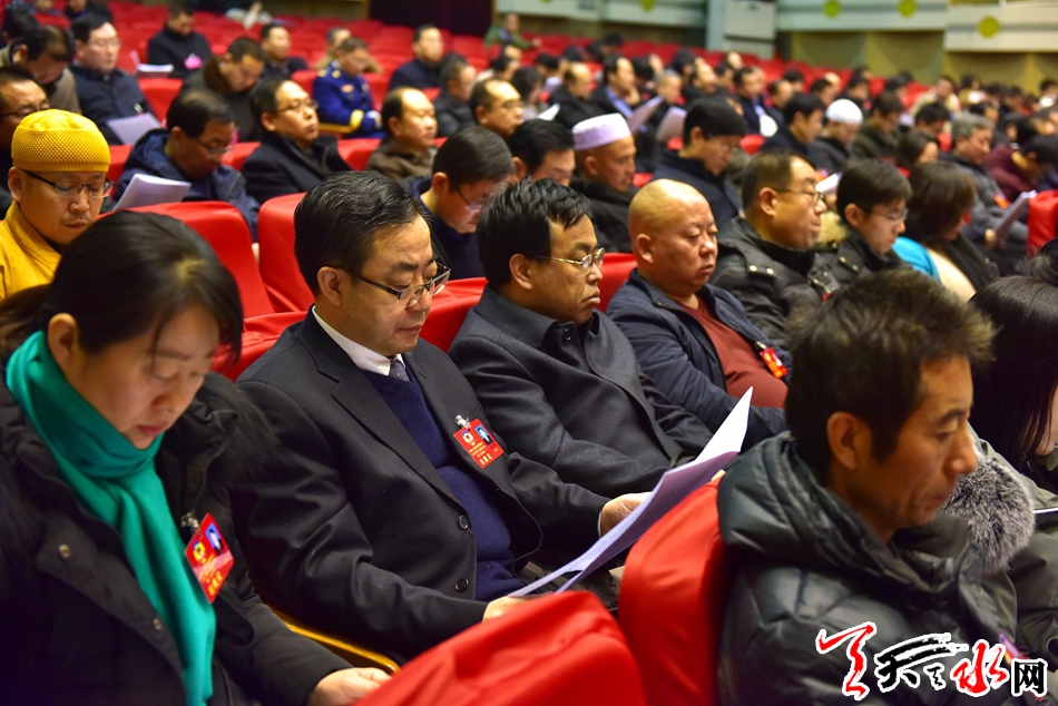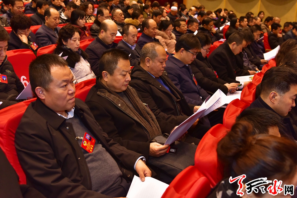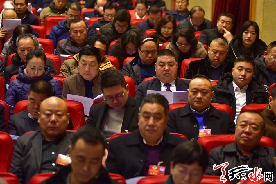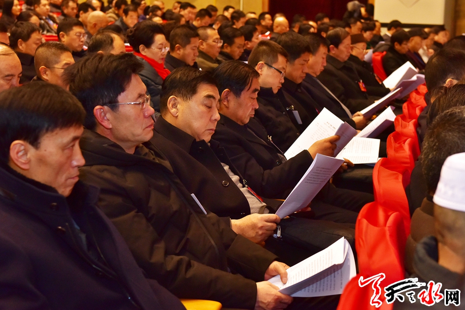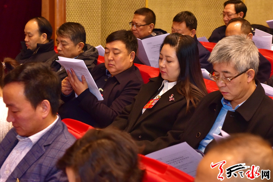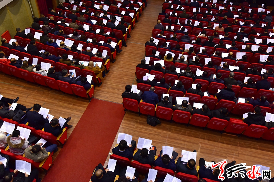 秦州剧院内,象征全国各族人民大团结的政协会徽悬挂于主席台正中,十面鲜艳的红旗分列两侧,“坚持以习近平新时代中国特色社会主义思想为指导,为实现中华民族伟大复兴的中国梦不懈奋斗” 的红色条幅格外醒目,处处洋溢着团结、民主、和谐、热烈的气氛。