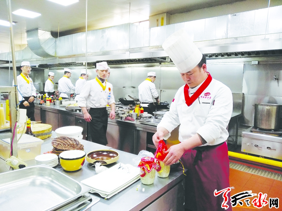 14日中午11时许,记者在天水迎宾馆餐饮部后厨见到宋小文时,他正在和同事们一起紧张地忙碌着。今年,天水迎宾馆餐饮部负责接待政协委员和工作人员共计400多人用餐。如此大的“工程”,主要是由宋小文和其他20多位同事操刀。