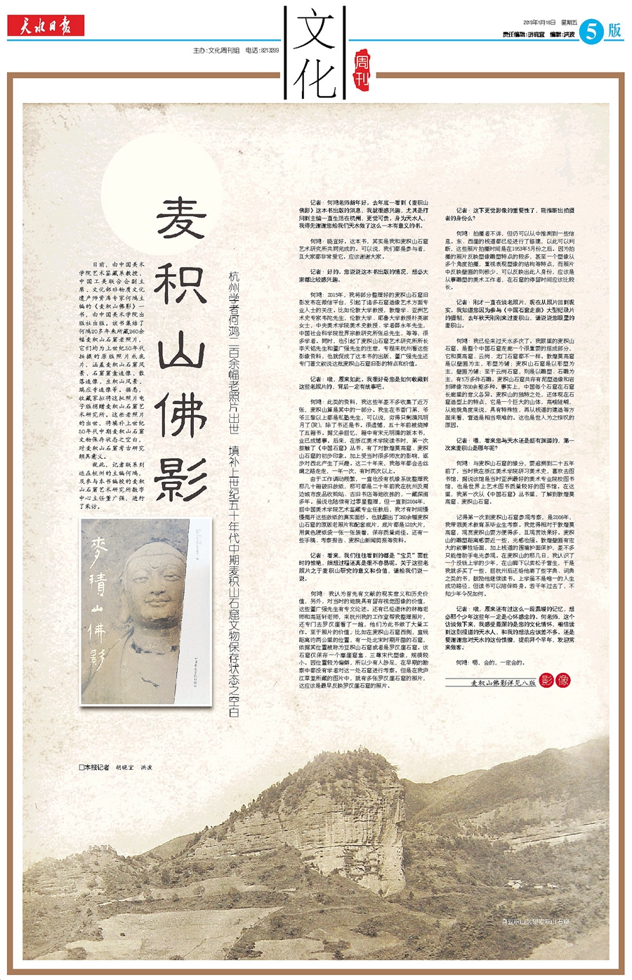 记者:何鸿老师新年好。去年底一看到《麦积山佛影》这本书出版的消息,我就很感兴趣,尤其是打问到主编一直生活在杭州,更觉可贵。身为天水人,我得先谢谢您给我们天水做了这么一本有意义的书。