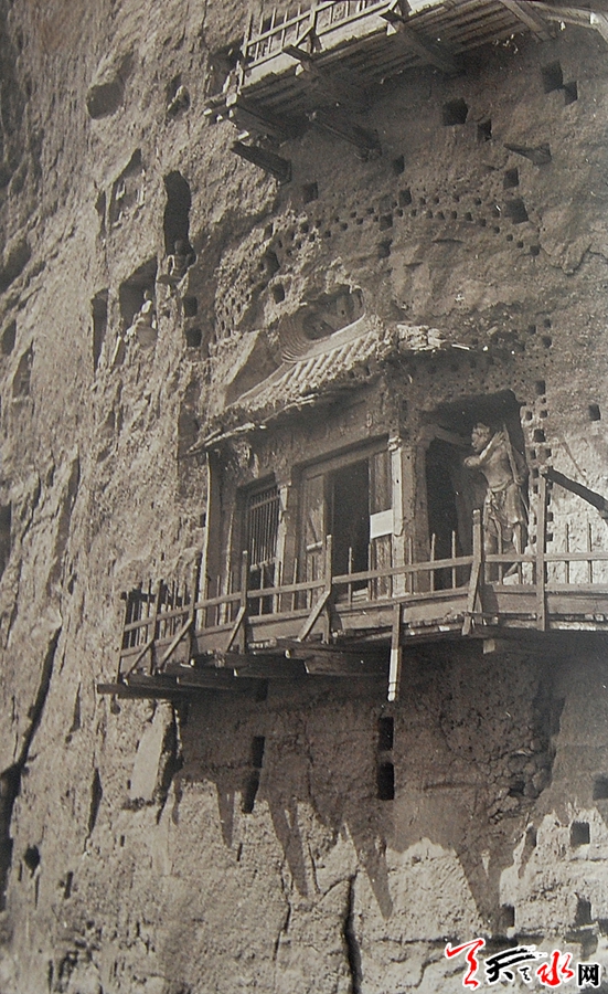 “早期的麦积山石窟外观全部是木质栈道,自1977年开始,麦积山石窟进行了大规模的山体加固工程,山体面貌发生较大的改变,之前的木质栈道已基本拆完,可惜当时没有留下太多的影像资料。庐江草堂所藏这张第43窟照片中洞窟外景的老栈道上,基本可以反映出当时麦积山石窟栈道的木结构工艺。”