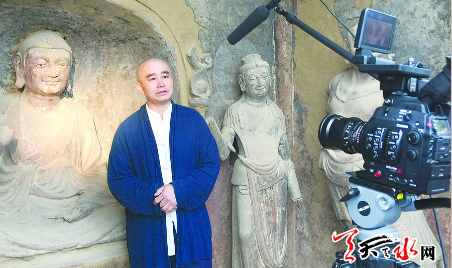 何鸿教授参加大型纪录片《中国石窟走廊》拍摄时在麦积山石窟的留影
